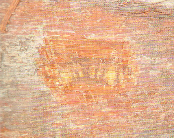 心邊材區(qū)別明顯。心材淺黃褐色,久則轉為巧克力褐色。邊材窄,金黃色。生長輪略可見。
