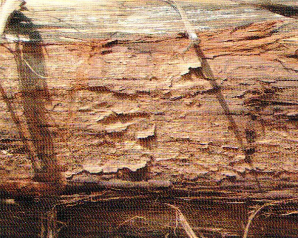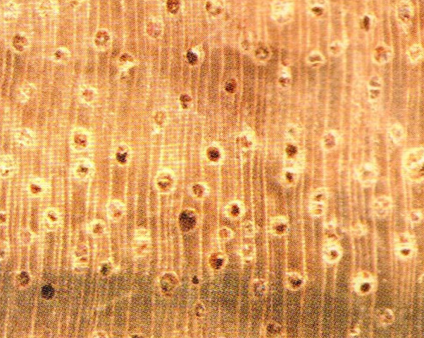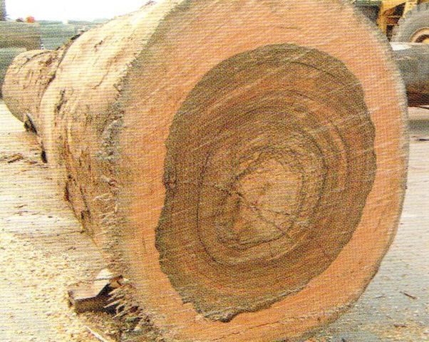心邊材區(qū)別明顯。心材暗褐色,常帶有深褐色至黑色同心圓狀的條紋,略似核桃木。邊材很寬,灰黃色或淺玫瑰色,寬可達(dá)20cm以上。生長(zhǎng)輪略明顯、較均勻。