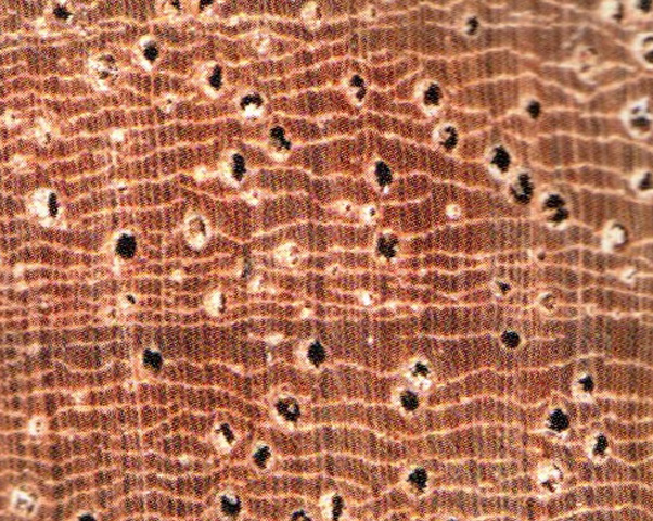 心邊材略明顯。心材暗紅褐色帶紫色調,心部具不規(guī)則花紋。邊材色稍淺,寬3~4cm。生長輪略明顯,輪間界以深色組織帶。